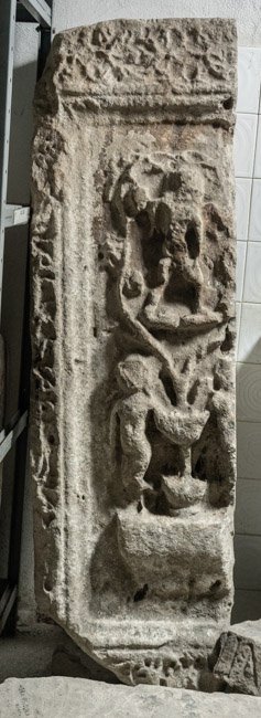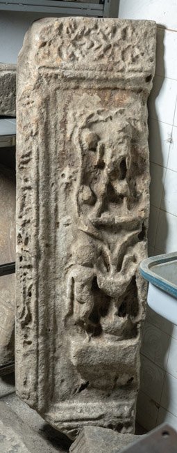 - Unten Basisblock, darauf Gefäß, aus dem Ranken wachsen, seitlich davon Eroten. Darüber Standleiste mit Pan-Silvanus zwischen Weinranken. Profilrahmen, außen Leisten mit Ornament.