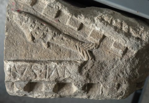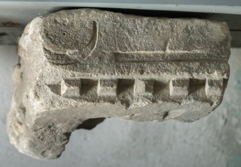 - Teil eines dachförmigen Deckels. Giebelfeld mit Zahnschnitt gerahmt, im erhaltenen Eck Fisch, darunter Inschrift. Auf der Längsseite Zahnschnitt, darüber Mondsichel und schmales eingetieftes Feld.