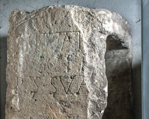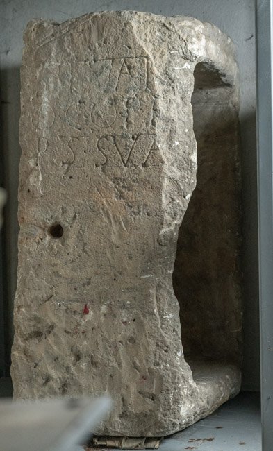 - rechte Seite abgearbeitet u. zu Sarkophag ausgehöhlt, oben verbr., Inschrift verrieben