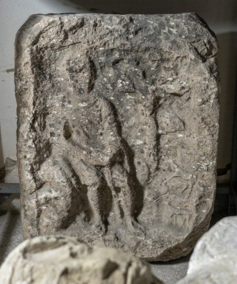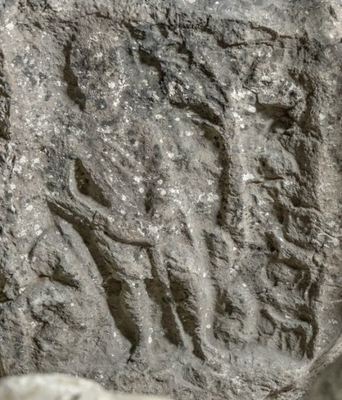 - Mythische Figur: auf Felsen sitzender Mann im Mantel mit Stab, rechts Baum und mehrere übereinander gestaffelte Tiere (Silvanus ? Hirte ?).