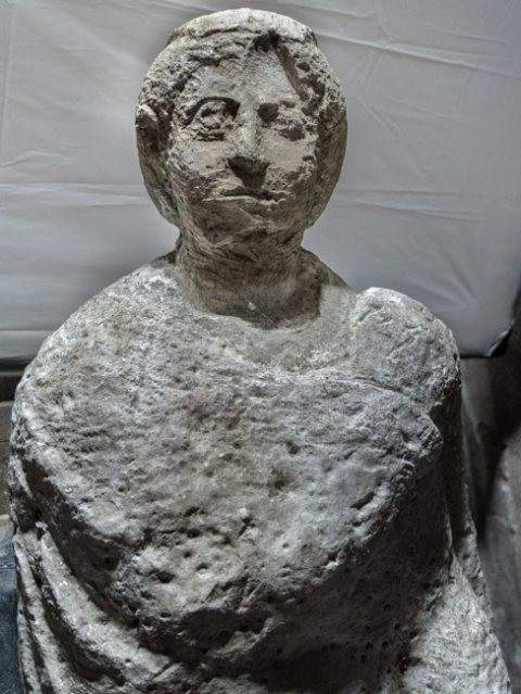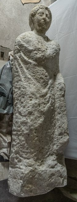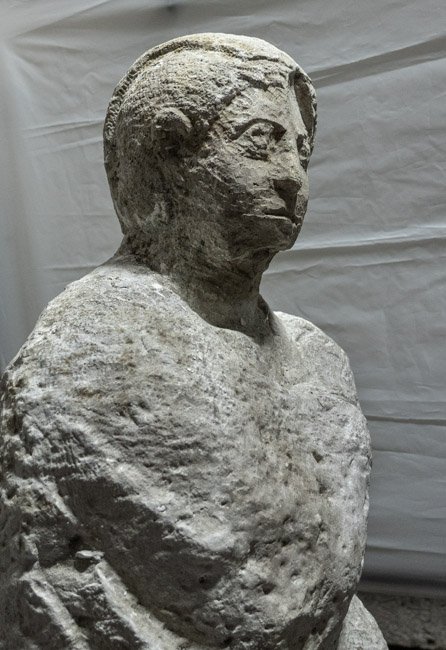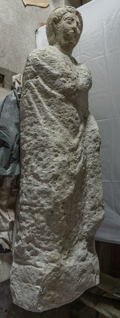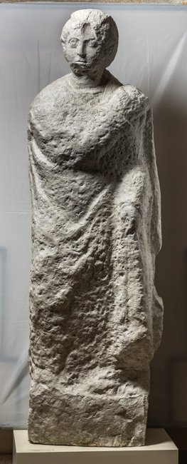 - Porträt einer in den Mantel gehüllten stehenden Frau mit Scheitelzopf. Grabstatue ?