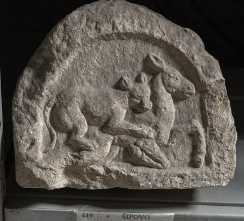 - Halbrunder Deckel, auf der Stirnseite Raubkatze mit Beutetier (Esel ?).