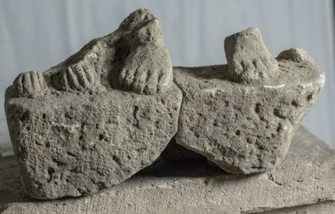- Mythische Figur (Diana ?): rechteckiger Basisblock, darauf nackte menschliche Füße, neben dem rechten Fuß Tatzen eines Tieres.