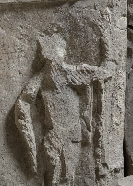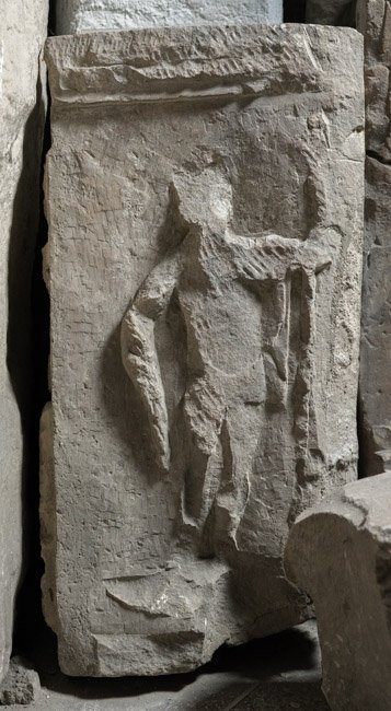 - Mythische Figur: stehende männliche Figur, Mantel über der linken Schulter, in der erhobenen Linken Stab (Thyrsos ?), im rechten Arm Zweig (?). Liber Pater ? Satyr ?