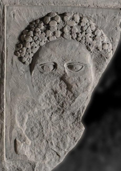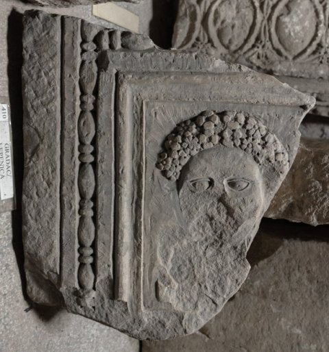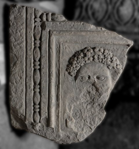 - Fragment einer Kassettendecke ? Ecke eines profiliert gerahmten und von Perlstäben eingefassten Feldes, darin Kopf mit Blütenkranz. Personifikation einer Jahreszeit ?