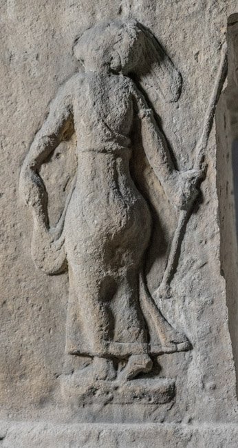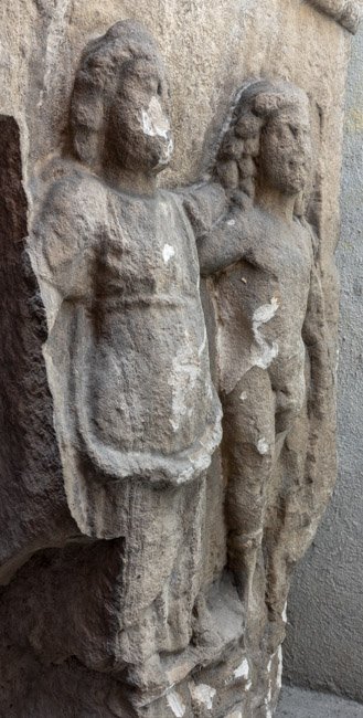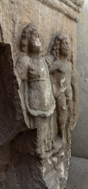 - Vorder- und Rückseite abgearbeitet, eine Nebenseite unten tlw. abgebr., Reliefs tlw. rezent bestoßen