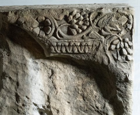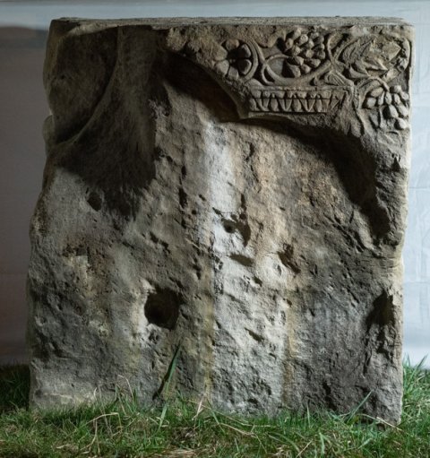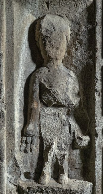 - Vorderseite fast völlig zerstört, Reliefs stark verwittert, Sockel u. Bekrönung fehlen