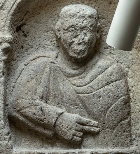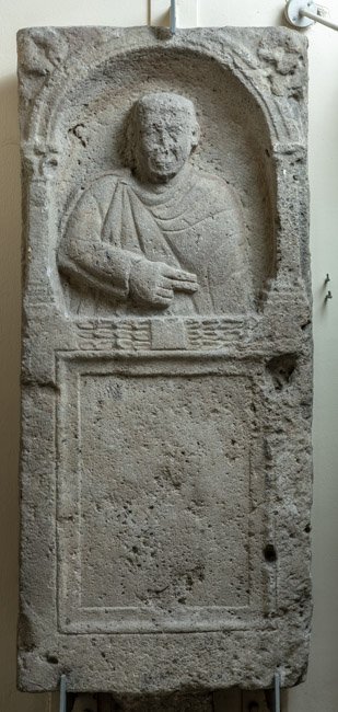 - Über dem gerahmten leeren Schriftfeld Bogennische mit Halbfigur eines bärtigen Mannes in Ärmeltunica und Sagum. Seitlich Pilaster, in den oberen Zwickeln Meerwesen (?). Auf der unteren Rahmenleiste Blattornament.