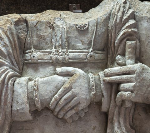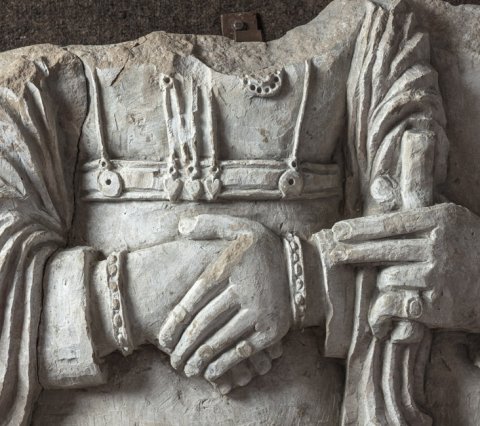 - Bildnische mit glatten Pilastern, zwei Halbfiguren (Ehepaar). Links einheimische Frau mit Ärmelgewand und Umhang, Gürtel, Brustschmuck, Armbändern. Vom Mann nur linke Hand mit Fingerring und Rolle (volumen) erhalten.