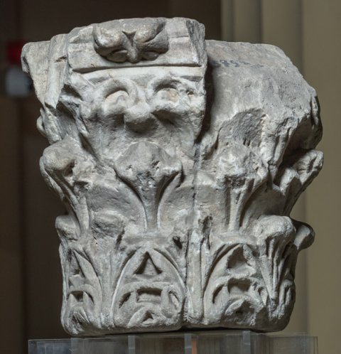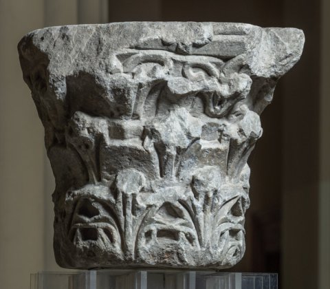 - Blattspitzen u. Voluten abgebr., Abacusrand tlw. abgebr.