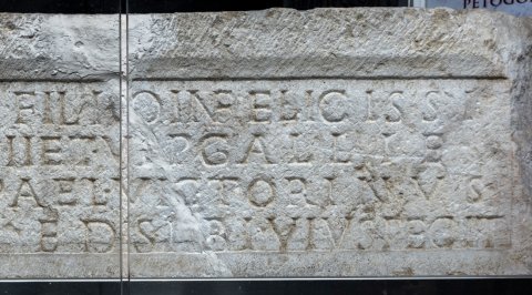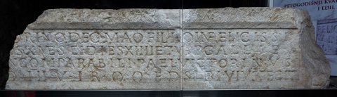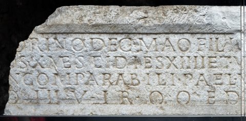 - [--- Vict]orino dec(urioni) m(unicipii) Aq(uae) fili[o]q(ue) infelicissi/[mo vixit ann]os X(!) me(n)s(es) L(?)I(!) dies XIIII et Ulp(iae) Galli(a)e / [coniugi? i]ncomparabili P(ublius) Ael(ius) Victorinus / [---] q(uaestor) II[[I]]vir q(uin)q(uennalis) ed(!) sibi vi(v)us fecit