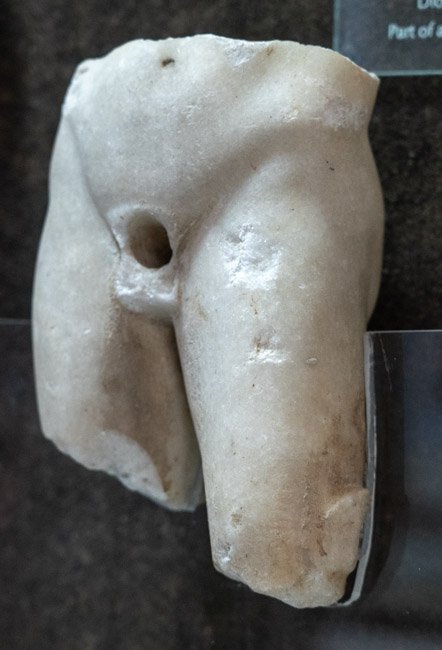 - Hüftpartie und Teile der Oberschenkel erhalten, bestoßen, runde Bohrung in der pubes