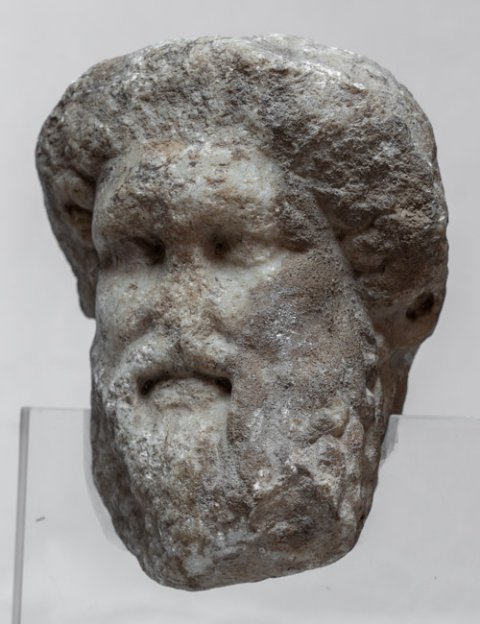 - Mythische Figur: Kopf eines Gottes mit Bart und langem, um die Stirn aufgerolltem Haar. Zeus ?