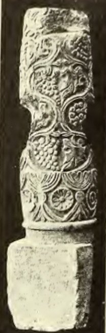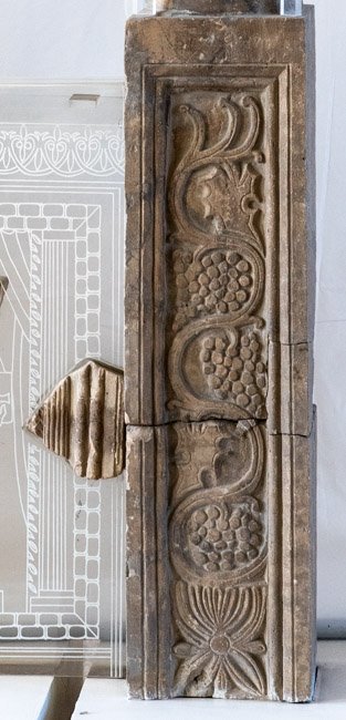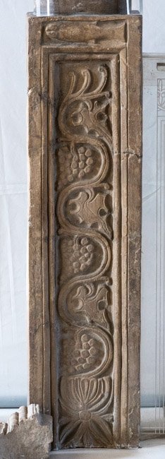 - Pfeiler mit Weinranken, die aus Kelchen wachsen; auf einem Pfeiler auf dem oberen Rand Fischrelief. Auf den Pfeilern stehende Säulchen mit Spiralkanneluren oder Ranken und Stierkopfkapitellen.