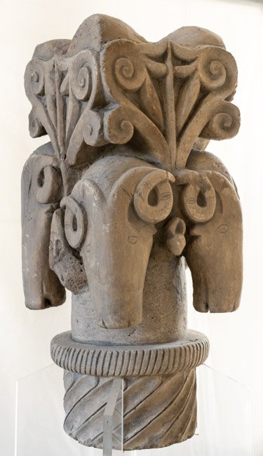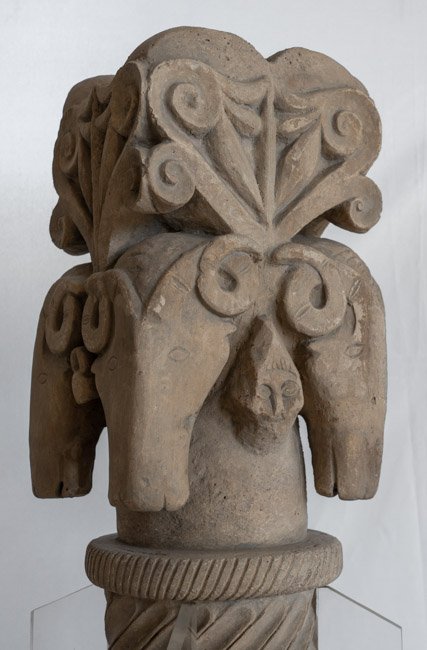 - Kapitell mit vier Stierköpfen, darüber vierseitiger Aufsatz mit Volutenornament. Zwischen den Stierköpfen kleine Reliefköpfe (zwei menschliche, zwei Hasen). Unten tordierter Wulst und Ansatz des Säulenschaftes.