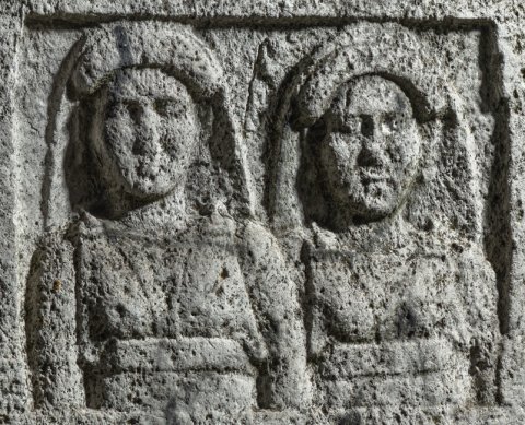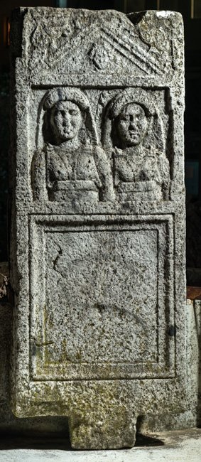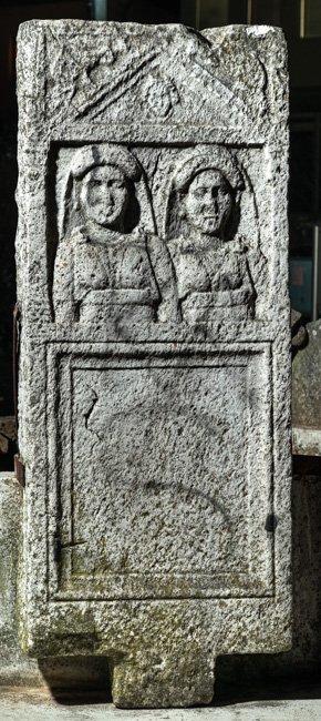 - Eingeschriebener Giebel mit Gorgoneion, über den Giebelschrägen Delphine. Einfach gerahmtes Bildfeld mit Halbfiguren von zwei einheimischen Frauen mit Haube und Schleier, Fibeln, breiten Gürteln.