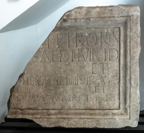 - [---]s P(ubli) f(ilius) Tro(mentina) Res/[titutu]s aed(ilis) IIIIvir i(ure) d(icundo) / [---] et / [---]o Hermae IIIIIIvir(o) Aug(ustali) / [p]atri et / Secundae matri t(estamento) f(ieri) i(ussit)