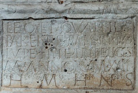 - Maximinus / sculpet(!) // D(is) M(anibus) // Leo et Quartil[la] / parentes miseri po(suerunt) / Lup(a)e fili(a)e infelicis(s)i/m(a)e annorum XXII / h(oc) m(onumentum) h(eredem) n(on) s(equetur)