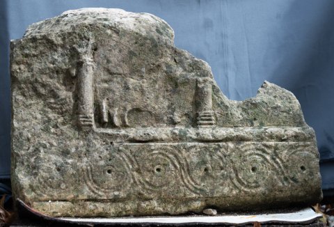 - Nach rechts hin stehende Lämmer zwischen Säulen, unten Rahmenleiste mit geritztem Flechtband. Fragment einer Schrankenplatte.