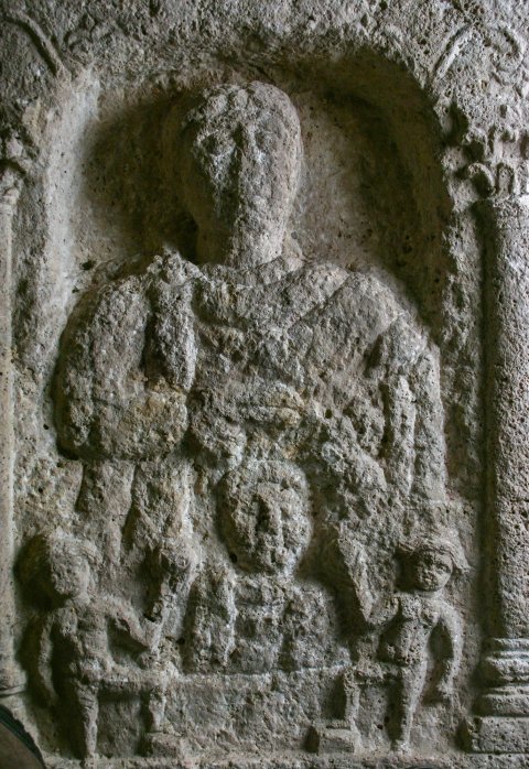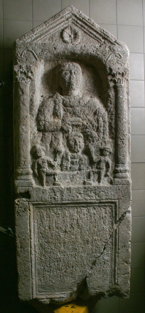 Im Hauptbild Familie, Genius : zwischen Säulen mit Blattkapitell Halbfigur eine Mannes: Sagum, Zwiebelknopffibel. Vor ihm Büste eines Kindes (Knabe), flankiert von nackten Genien. - Inschrift