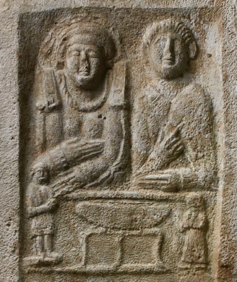 In Rechtecknische zwei Brustbilder (Ehepaar). Links einheimische Frau: Haube, Umhang, Flügelfibeln, Torques, Armreifen. Rechts Mann: bärtig (?), gesträhntes Haar, Ärmeltunica, Sagum mit Bügelfibel.