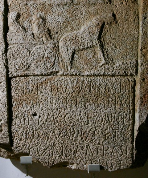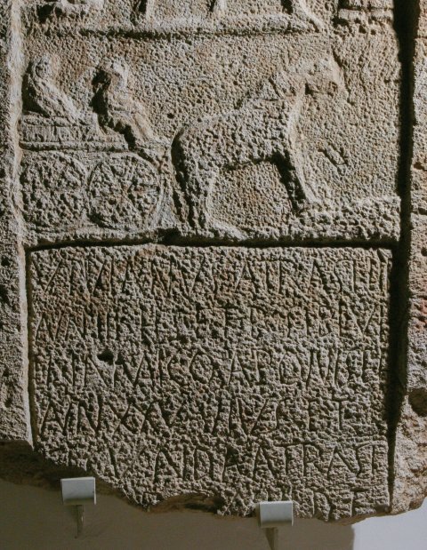 - Vivianus Atrasi ifl(ius)(!) / ann(orum) III h(ic) s(itus) e(st) t(itulum) p(osuit) sibi viv(o) / Enamaico Aponis fil(ius) / ann(orum) XXV vi(v)us et / Secunda Atrasi / [fil(ia) a]nn(orum) XXII de/[functa ---]/[---