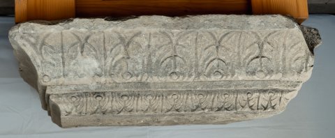 - Linke Gesimsecke, auf der Vorderseite Kyma und stilisierter Palmettenfries, linke Seite glatt profiliert.