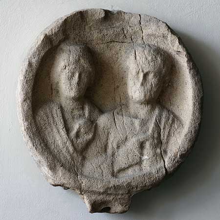 - Zwei Brustbilder (Ehepaar). Links Frau: antoninische Frisur ? (Scheitelzopf ?), Tunica, Mantel, Halskette, in der Rechten Apfel. Rechts Mann: bärtig, Ärmeltunica, Toga, in der Linken Rolle (volumen).