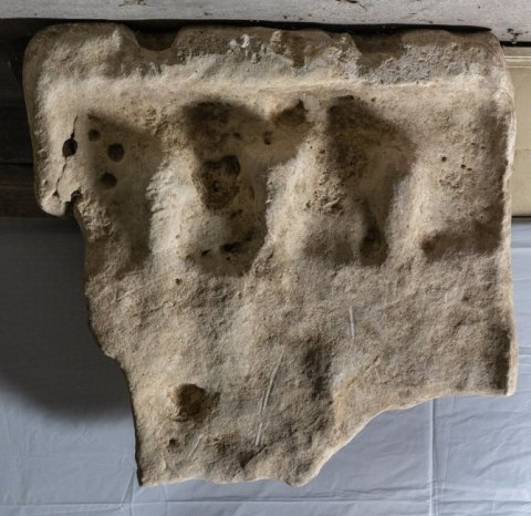 - in rechteckigem Bildfeld Brustbilder (?) von drei Personen, vorn Kind (?).