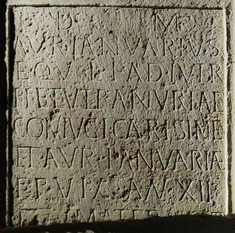 - D(is) M(anibus) // Aur(elius) Ianuarius / equ(es) l(egionis) II Adiutr(icis) / p(iae) f(idelis) Se(verianae) et Ulp(iae) (I)anu(a)riae / coniugi caris(s)im(a)e / et Aur(eliae) Ianuariae / f(iliae) p(ientissimae) vix(it) ann(os) XII / et Aur(elio) Materno f(ilio) / [---