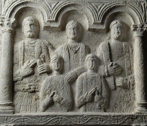 Im Hauptbild Familie: unter drei Bögen auf Säulen Halbfiguren von drei Erwachsenen und zwei Kindern. Links Mann: bärtig, Ärmeltunica, Gürtel mit Ringschnalle, Sagum, in der Linken Rolle (volumen). Waffen: Schwert. In der Mitte Frau: Haarnetz, Scheitelschmuck, Ohrgehänge, Ärmeltunica, Umhang, Kette mit Medaillon. Rechts Frau: Mittelscheitel, Ärmeltunica, Umhang, Armband, in der Rechten Apfel. Vorn links Mädchen: Scheitelschmuck, Ärmeltunica, Mantel, in den Händen Vogel. Vorn rechts Knabe: Ärmeltunica, Sagum, in der Linken Rolle.