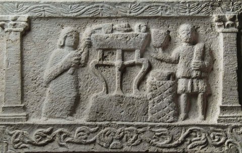 Im Zwischenbild Totenopfer: zwischen Pilastern dreibeiniger Tisch mit Speisen, links Dienerin, rechts Diener mit Becher und mappa, vor ihm hoher Deckelkorb.