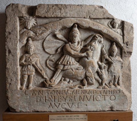 - Mythos (Mithras): Stiertötung (Tauroktonie) mit Cautes und Cautopates, Hund, Schlange, Skorpion, oben Rabe und Büsten von Sol und Luna.