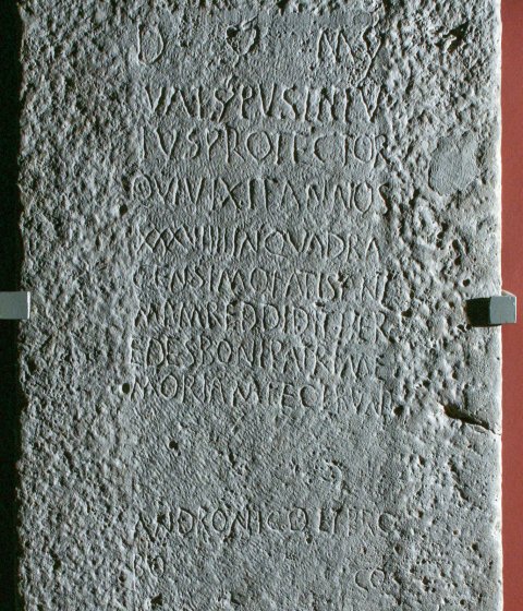 - D(is) M(anibus) / Val(erius) Pusintu/lus protector / qui vixit annos XXXVIIII in quadra/ge{n}simo fatis ani/mam reddidit her/edes boni(!) patri me/moriam fecerunt / Andronico et Pro/bo co(n)s(ulibus)