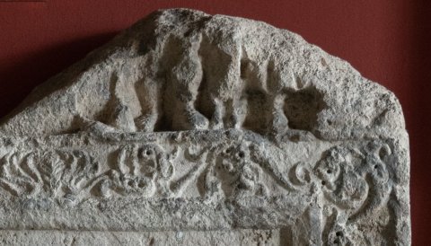- Auf den Rahmenleisten des Schriftfeldes Ranken, die aus einem Akanthuskelch wachsen. Oben in der Mitte Palmette. Oberhalb davon Reliefreste (stehende Figuren).