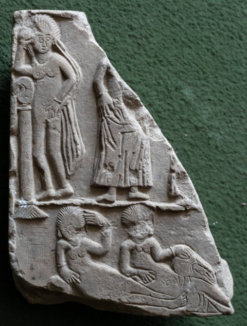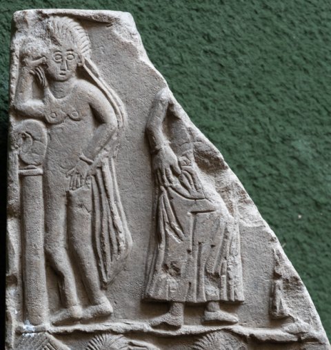 - Mythische Figuren: Relief mit zwei Registern. Oben links nackte weibliche Figur (Venus ?) an eine Säule gelehnt, rechts weibliche Figur im langen Gewand und Rest einer weiteren Person. Unten zwei gelagerte Nymphen.