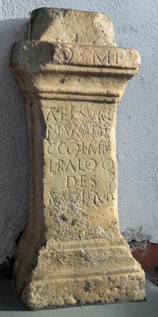 - [I(ovi)] O(ptimo) M(aximo) F(ulguratori) / C(aius) Ael(ius) Suri/nus de/c(urio) col(oniae) M(ursensium) II v/iral(is) q(uin)q(uennalis) / des(ignatus) / v(otum) s(olvit) l(ibens) m(erito)