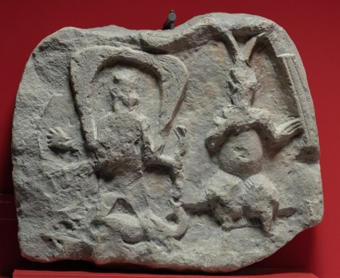 - Mythische Figuren: Diana mit velum-Schleier, in der Linken Bogen, hinter den Beinen liegendes Tier (Hirschkuh ?). Frontal stehender Silvanus-Pan mit Syrinx (?).