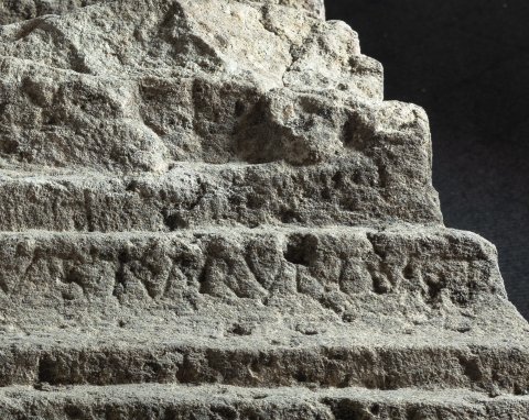 - in der Kehle des Sockelprofils auf der Vorderseite und der linken Seite Inschriftreste
