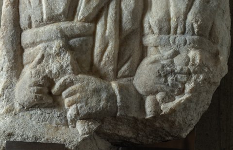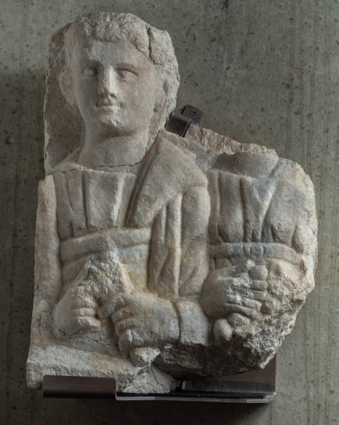 - Brustbilder eines Jünglings in Toga contabulata, in der Linken Rolle (volumen), an der Hand Fingerring. Zu seiner Linken Frau in gegürtetem Kleid, in den Händen Weintraube (?).