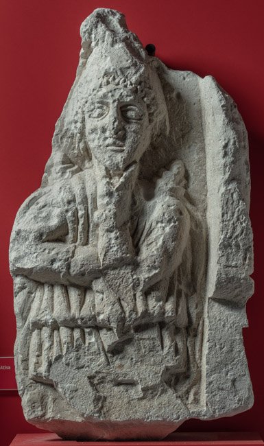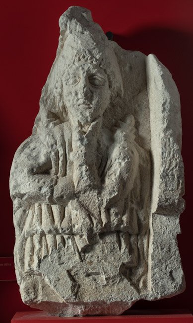 - Eckblock. Auf der Vorderseite mythische Figur: Attis mit phrygischer Mütze, Kinn in den Hand gestützt. Auf der rechten Nebenseite horizontale Profilleiste, darüber Reliefrest.