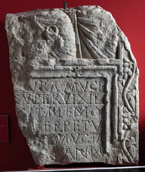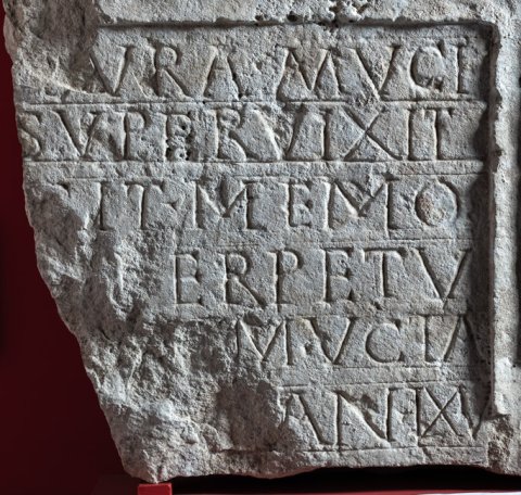 - [--]SVRA Muci/[us] Super vixit / [an(nos) -]III memo/[riae p]erpetu/[ae pos(uit)?] Mucia / [---] an(norum) LXV / [---