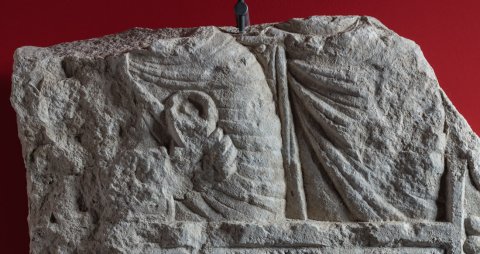 - Familie: Halbfiguren von drei Personen, die linke abgeschlagen, rechts und in der Mitte (?) Mann im Sagum, die mittlere Person mit Attribut in der rechten Hand. Auf der seitlichen Rahmenleiste Weinranke.