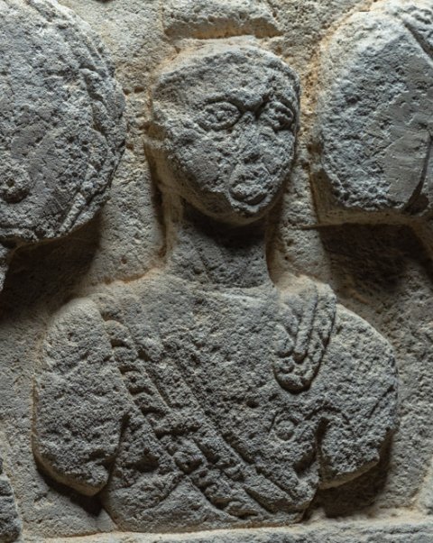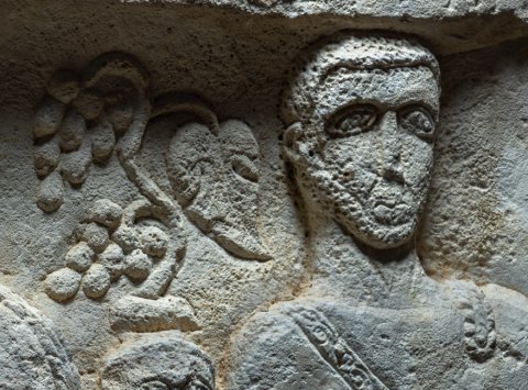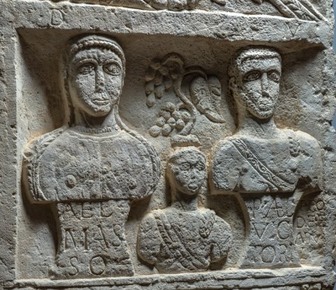 - Giebel mit Rosette, links Blatt, rechts ascia, Palmettenakrotere. In der Bildnische Büsten einer Familie: Ehepaar auf Sockeln (Frau mit Schleier und Halsband, Mann bärtig, mit Schwertgurt), zwischen ihnen Kind (Knabe). Über dem Kind Weinranke. Profilgerahmtes Schriftfeld zwischen Säulen mit Spiralkanneluren.