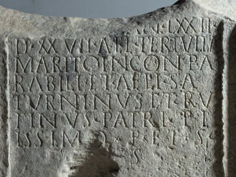 - [------] / [------] / [--- a]n(norum) LXXII / d(ierum) XXVII Ael(ia) Tertulla / marito inconpa/rabili(!) et Aeli Sa/turninus et Ru/finus patri pi/issimo p(osuerunt) et s(ibi) / [et] s(uis)
