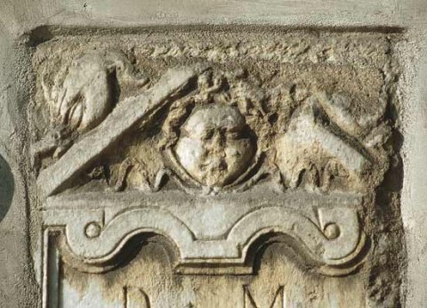 - Eingeschriebener Giebel mit Gorgoneion, auf den Schrägen Delphine. Rahmen des Schriftfeldes mit sogen. Barockmotiv.