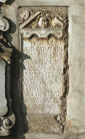 - D(is) M(anibus) / Aur(elio) Saturnino / vet(erano) o(bito) an(norum) XLV et Aur(eliae) / Secundin(a)e con(iugi) / o(bitae) an(norum) XXXV et Aur(elio) Se/ cundino fra(tri) o(bito) an(norum) / VII Decimia Qua/eta avia / Aur(elius) Crescenti/nus parentibus / carissimis
