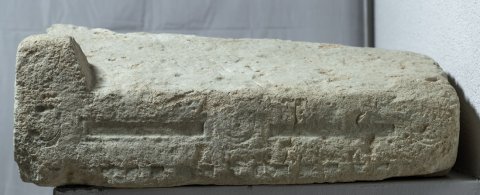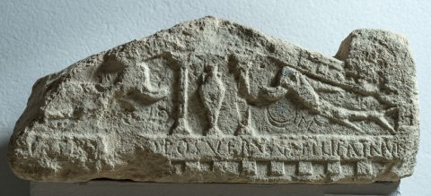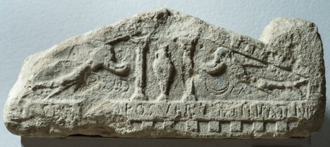 - Dachförmiger Deckel mit Akroteren. Auf dem Giebel der vorderseite Amphore in Aedicula, flankiert von Delphinen, unter diesen Mondsicheln. An den Giebelrändern Zahnschnitt, der sich auf die Längsseiten fortsetzt, auf horizontaler Leiste Inschrift.