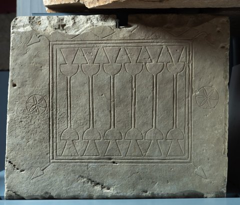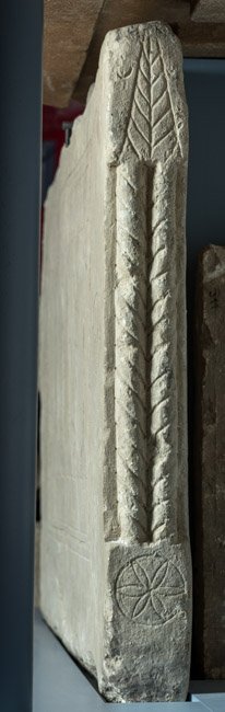 - Linke Seitenwand einer aus Platten zusammengesetzten Aschenkiste. Auf der Außenseite Ritzzeichnung: rechteckiges Bildfeld, darin Reihe von Stäben mit becherförmigen Enden oben und unten. An den Ecken des Rahmens je ein Efeublatt, seitlich je eine Kreisrosette, oben Rautenfries. An der Stirnseite zwei Säulchen mit Spiralkanneluren, darüber Palmzweig, darunter Kreisrosette.