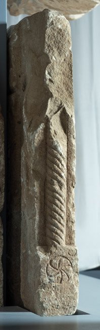 - Rechte Seitenwand einer aus Platten zusammengesetzten Aschenkiste. Auf der Außenseite Ritzzeichnung: rechteckiges Bildfeld, darin Reihe von Stäben mit becherförmigen Enden oben und unten. An den Ecken des Rahmens je ein Efeublatt, seitlich je eine Kreisrosette, oben Rautenfries. An der Stirnseite Säule mit Spiralkanneluren, darunter Kreisrosette.